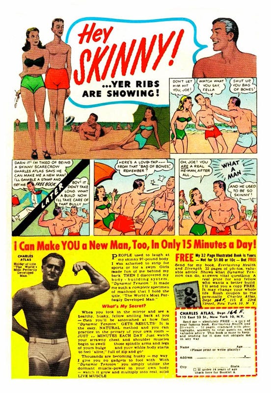 How to Make YOUR Body Bring You FAME instead of SHAME! Are You Skinny? Weak? Flabby? . . . I know what it means to have the kind of body that people pity! . . . I don't care how old or young you are or how ashamed of your present physical condition . . . I can shoot new strength into your old backbone . . . help you cram your body so full of pep, vigor and vitality that you won't feel there's even standing room left for weakness and that lazy feeling! . . .