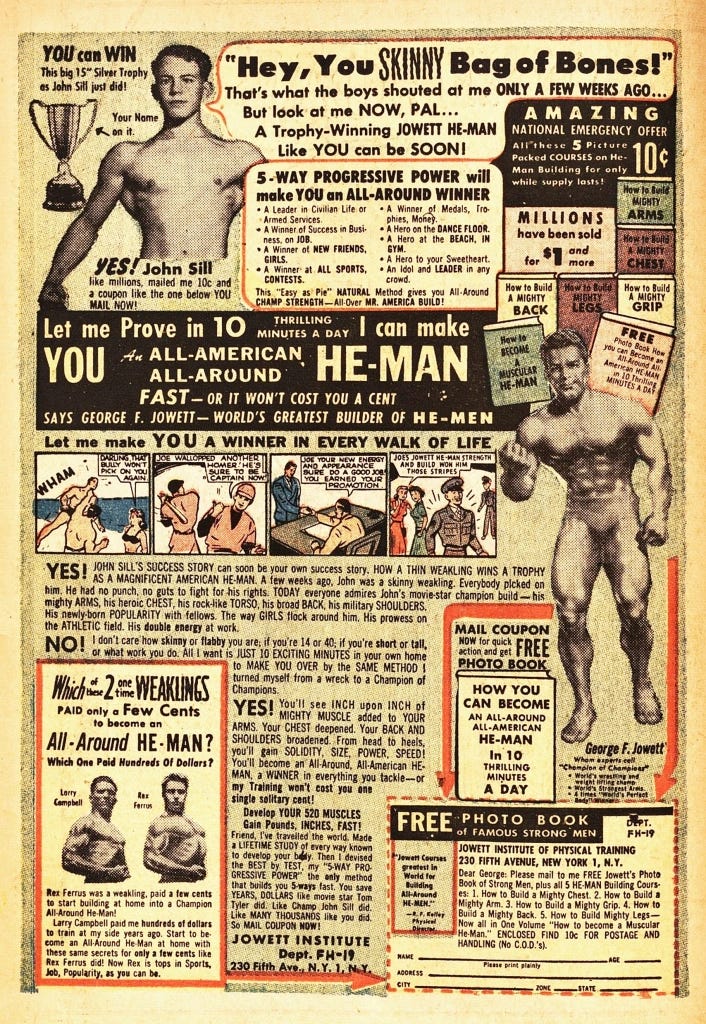 Another ad advising you how to become "an all-around HE-MAN" says "Prove it to yourself in one night!"