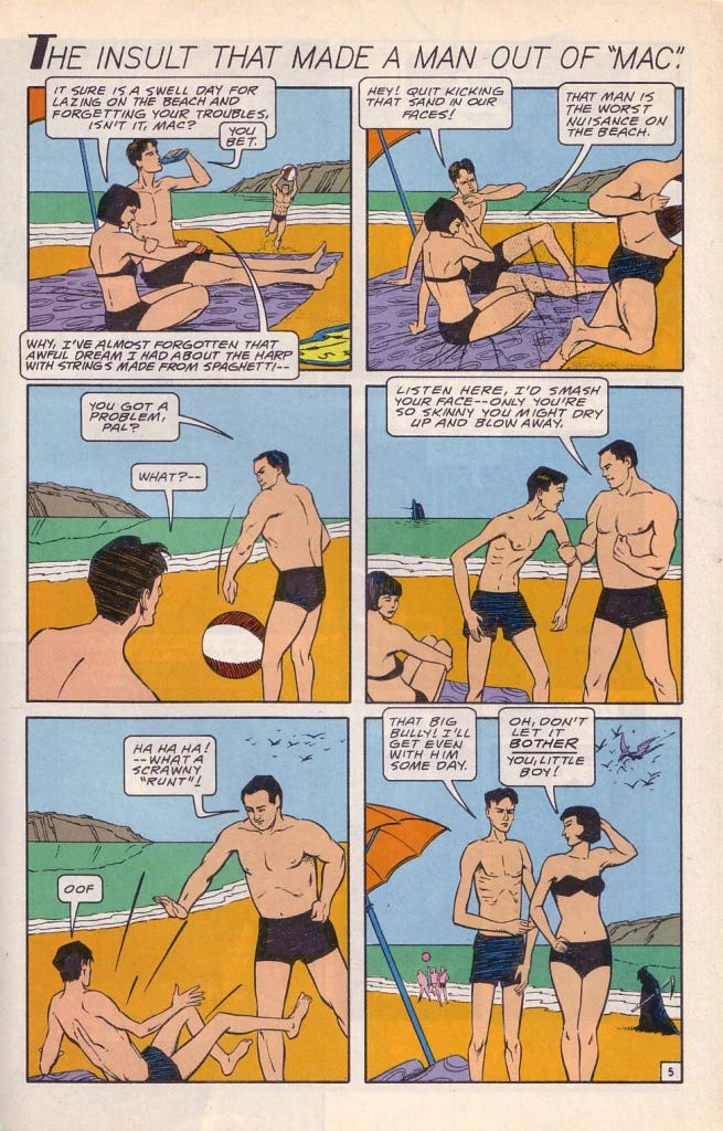 Does this look familiar? This is the first page of Flex Mentallo’s origin tale, as it appeared in Doom Patrol no. 42 (Mar. 1991, DC), written by Grant Morrison, with art by Mike Dringenberg and Doug Hazlewood.