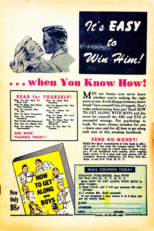 Many "human relations ads" are not exactly helpful to juveniles. One is for a course for boys on getting along with girls: