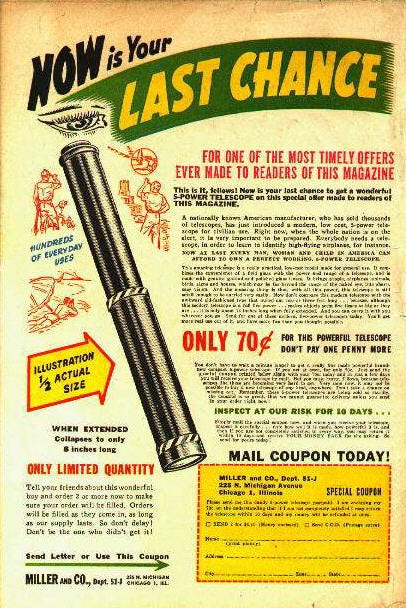 Comic books have other dubious advertisements of miscellaneous character. I have examined and treated a number of youths after they had been arrested for prowling about trying to look in windows to see women undressing. Most of them were rather harmless and responded readily to common-sense forms of psychotherapy and guidance. One of them told me about "peeping Tom ads" in comics and other boys confirmed their suggestive significance. There are telescope ads, for example, offering: